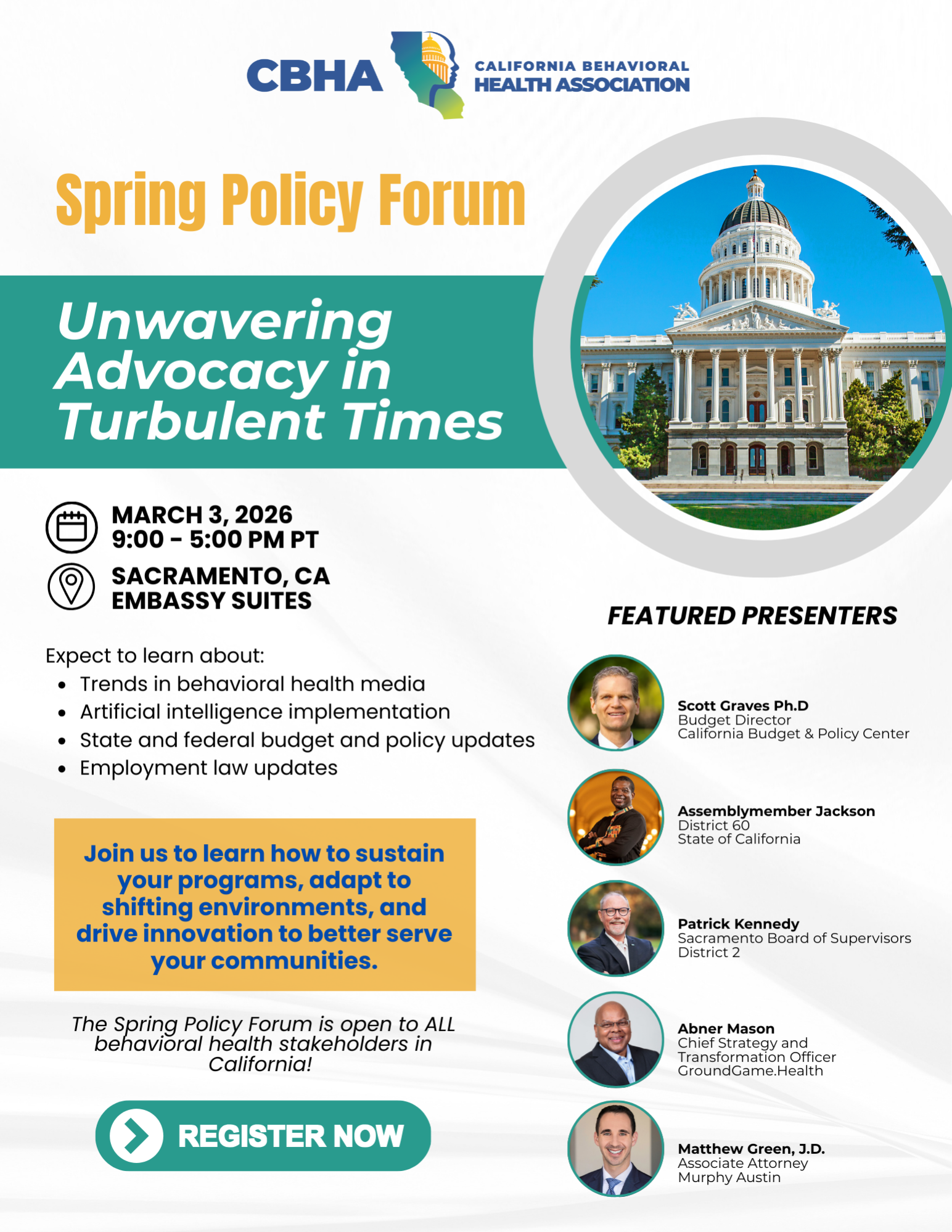 The CBHA Spring Behavioral Health Policy Forum brings together behavioral health leaders, policymakers, and partners for timely conversations about what is shaping the field. Hear from experts, connect with peers, and leave with practical insights you can use.